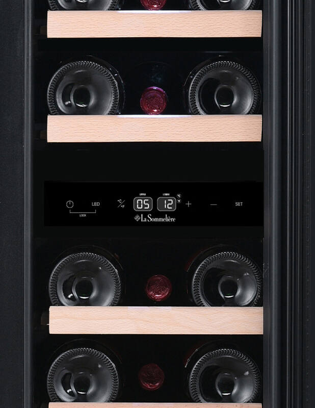 - Dolní zóna: Kapacita 12 lahví, nastavitelná mezi 5°C a 20°C.